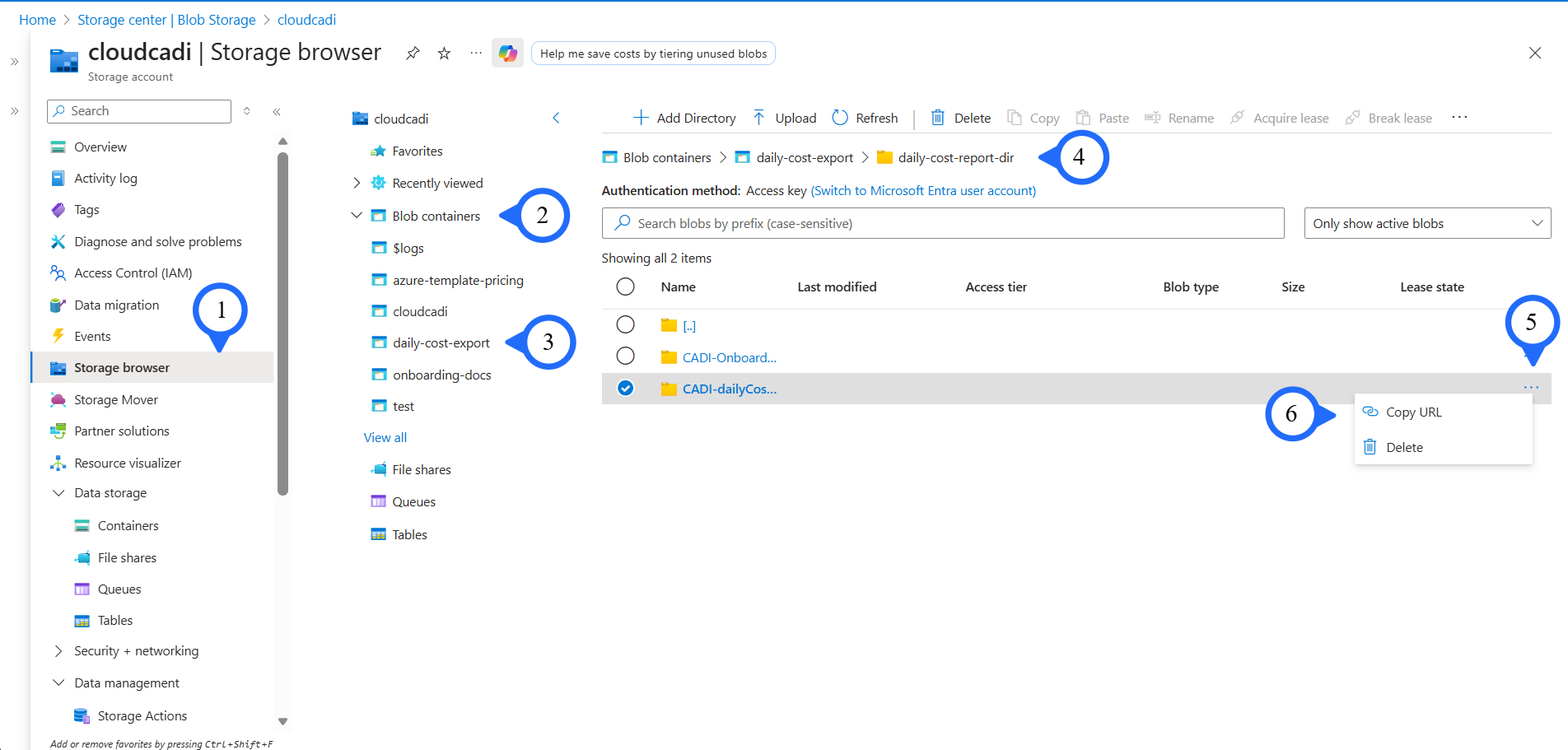 - Proceed further to the folder created during creation of the cost export Here it is "CADI-Onboarding"