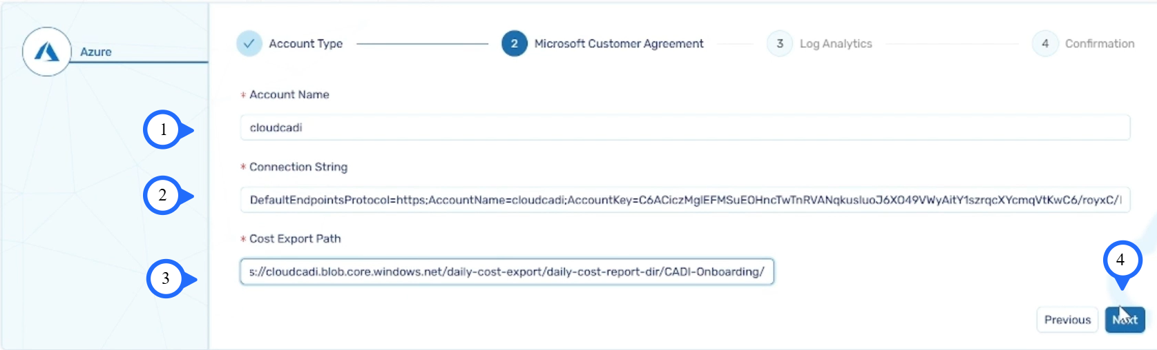- After getting the details from the Azure portal, Fill the "Connection String" and "Cost export path" in the 'MCA' screen.